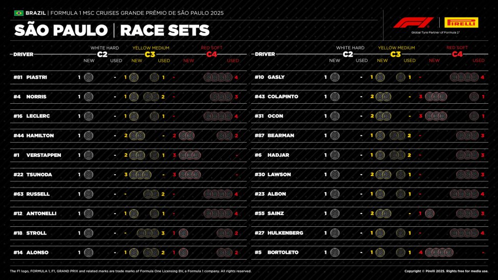 Verstappen heeft nog altijd zes sets verse banden over: drie sets zachte banden, twee sets mediumbanden en één set harde banden. Ter vergelijking: Norris heeft nog maar twee sets verse banden over, één set harde banden en één set mediumbanden. Oscar Piastri, Charles Leclerc en Kimi Antonelli zitten in hetzelfde schuitje als Norris, terwijl Russell alleen nog een set verse harde banden heeft.