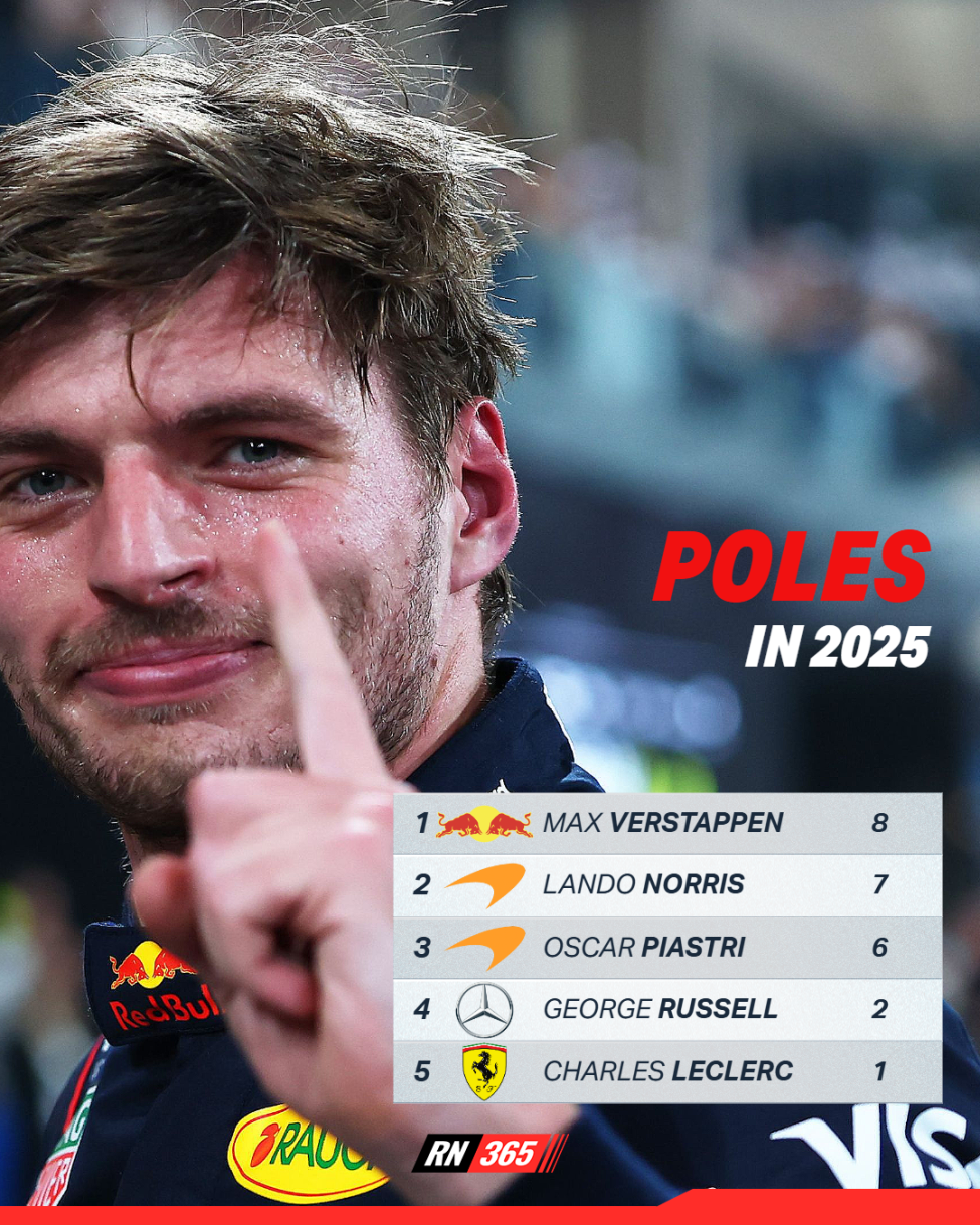 Met zijn snelste ronde in Q3 in Abu Dhabi brengt Verstappen zijn totaal op acht polepositions. Daarmee laat hij zijn McLaren-rivalen achter zich: Norris blijft steken op zeven, Piastri op zes. Een bijzondere prestatie van de viervoudig wereldkampioen, zeker omdat de MCL39 dit jaar over het algemeen wordt gezien als de snelste auto van het veld.