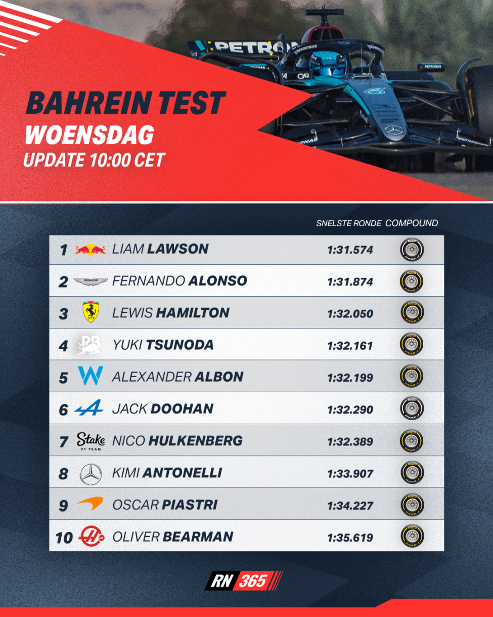 In Bahrein kunnen we gerust spreken van een gemoedelijke ochtend. Grote problemen bleven uit, evenals uitstapjes en foutjes. McLaren (17) is het minst productieve team, aangezien ze Oscar Piastri voortdurend één enkele outlap lieten rijden. Ook qua rondentijd vertoeft het team nagenoeg achteraan, maar in deze fase van de test kan dit allemaal nog vooropgezet plan zijn.