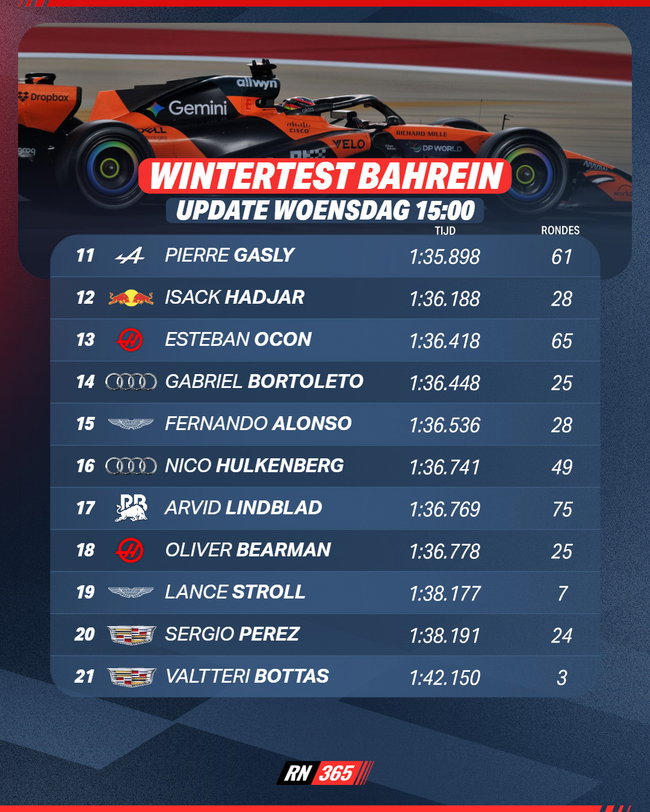 En dan Cadillac: na een late middagstart heeft Valtteri Bottas vijf ronden aan het totaal toe kunnen voegen dat door Sergio Perez in de ochtend op 24 was gebracht. Ook daar kan men alleen maar hopen dat de donderdag een betere dag wordt.
