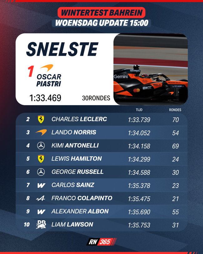 In de top drie van de dag heeft er één wijziging plaatsgevonden, namelijk dat Oscar Piastri zich direct achter zijn teamgenoot op P3 heeft gemeld, om vervolgens op te rukken naar P1. Meest productieve nieuwe coureur van de middag is George Russell, op de voet gevolgd door Liam Lawson.