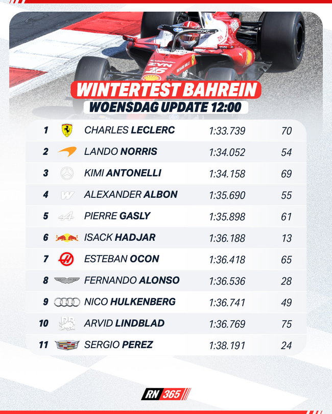 Lijstaanvoerder op dat vlak is Arvid Lindblad (75), met Charles Leclerc in zij kielzog (70). De Monegask topt wel het tijdenlijstje met 1:33.739 die hij al vroeg op de morgen noteerde. De top drie wordt gecompleteerd door Lando Norris en Kimi Antonelli met tijden gereden op de medium banden. Hadjar staat zesde met zijn snelste tijd op de harde band.