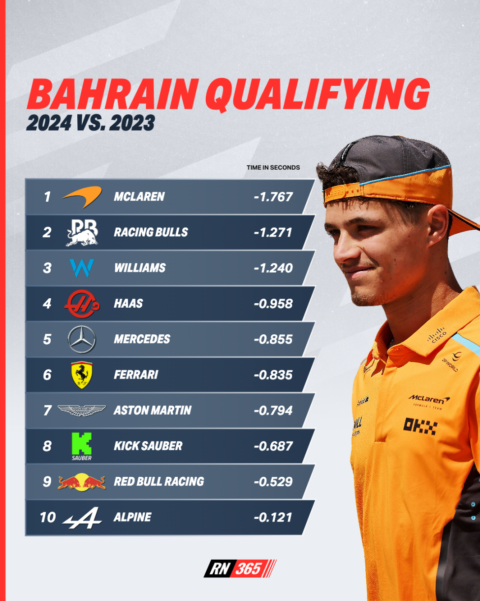 Toch is Red Bull net als vorig jaar de polesitter en heeft het in twaalf maanden tijd een halve seconde gewonnen. Aston Martin, Ferrari en Mercedes schommelen allemaal rond de 0,8 seconde winst in een jaar tijd. Het is goed om te vermelden dat Ferrari in Q2 sneller was dan Verstappen in Q3, waardoor de uitslag van de kwalificatie een licht vertekenend beeld geeft.