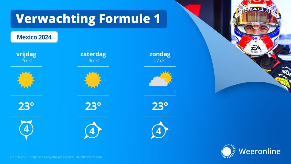 De buienkans in Mexico-stad, waar de GP van Mexico wordt gereden, is komende dagen heel klein. Het weerbeeld is zonnig en het wordt dagelijks zo'n 22 graden. Zondag, tijdens de racedag, zijn er wat meer wolken. Ook waait er een stevige noordoostenwind die behoorlijk vlagerig is.