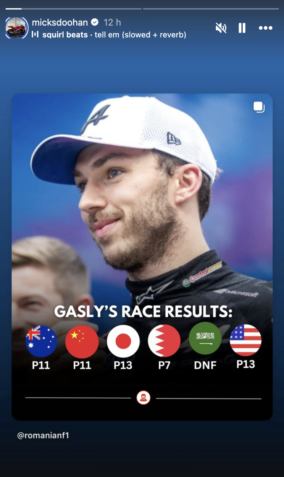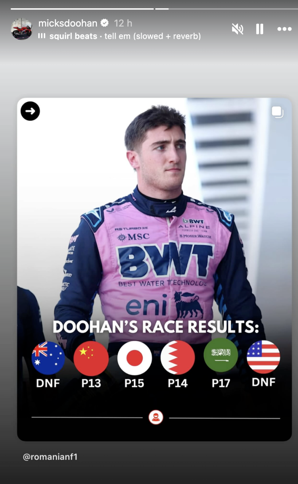 Op Instagram deelde hij een story van een F1-platform dat de resultaten van zowel de resultaten van Jack Doohan als Pierre Gasly liet zien, bij wijze van directe vergelijking. Hij geeft er geen commentaar bij, maar hij lijkt aan te willen geven dat de resultaten van zijn zoon lang zo slecht niet waren, of in ieder geval dat de ervaren Gasly niet héél veel beter presteerde. Dat gezegd hebbende tonen die statistieken juist ook aan dat hij Gasly nergens direct verslagen heeft.