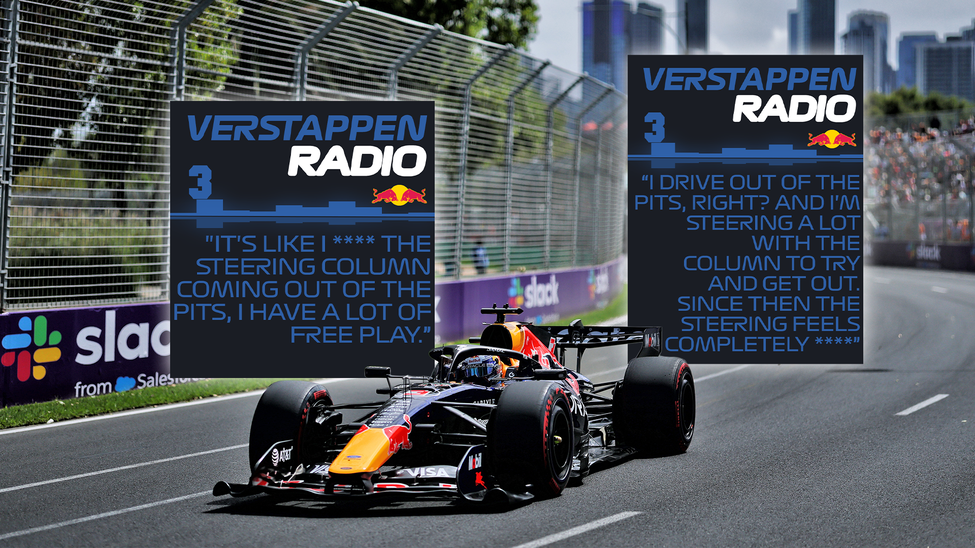 "Ik rijd uit de pits, toch? En ik stuur heel veel met de stuurkolom om eruit te komen. Sindsdien voelt het sturen compleet ***." Dat was het geval na het opheffen van de tweede rode vlag met nog een paar minuten op de klok in de training. Daarna was te zien dat Verstappen bij het invoegen in de fast lane zijn stuur 180 graden moest draaien om de hoek überhaupt te kunnen maken.