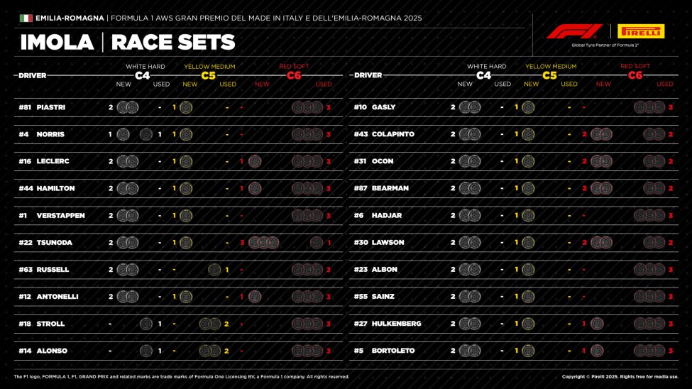Max Verstappen en Oscar Piastri, die op de eerste startrij beginnen, hebben dus in strategisch opzicht geen enkel voordeel ten opzichte van elkaar. Beiden hebben ze nog twee ongebruikte hards en één ongebruikte medium over, en beiden hebben ze hun drie setjes softs er al doorheen gejaagd. Zij zullen hun strijd dus met andere middelen moeten uitvechten.