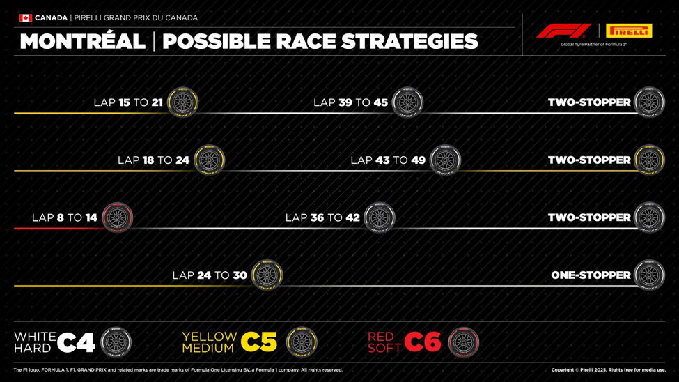 Dat zal ongetwijfeld weer kopzorgen opleveren voor de strategische teams tijdens de Grand Prix van Cabnada. De mogelijke strategieën aangeleverd door Pirelli kunnen daar misschien wat uitkomst in bieden, want de bandenfabrikant presenteert maar liefst vier mogelijke opties waar de teams uit kunnen kiezen. In drie van de vier gevallen raadt Pirelli aan om op de mediumband te beginnen. In slechts één geval lijkt de soft de betere keuze te zijn voor de start.