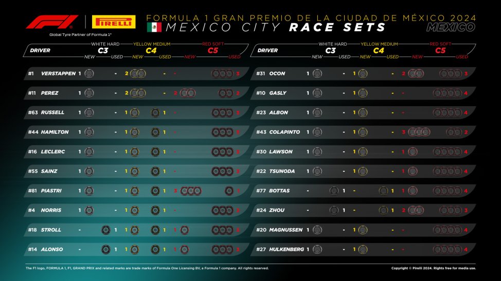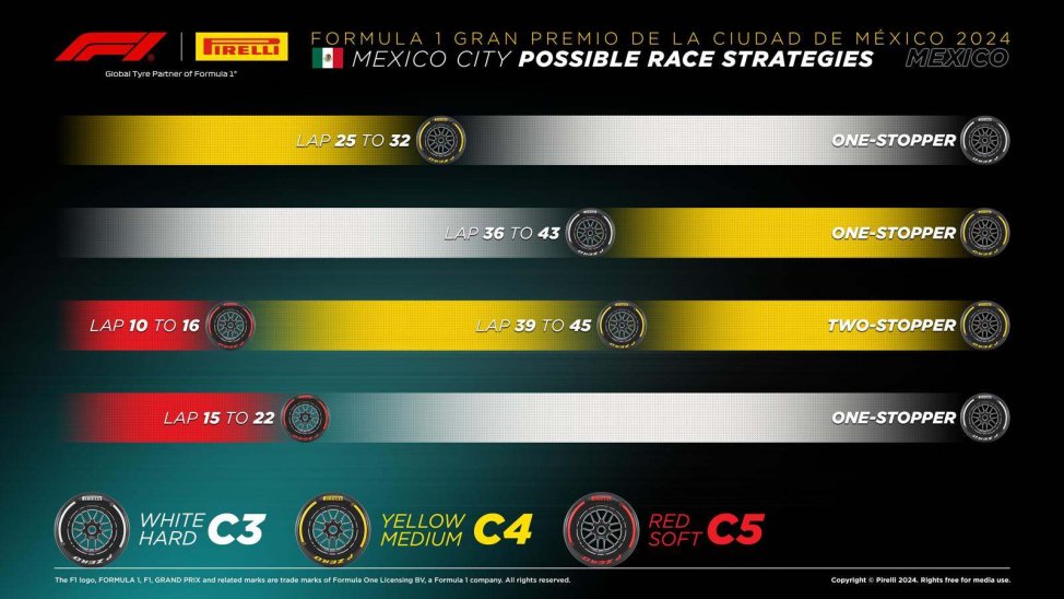Volgens Pirelli is de kans erg groot dat het een eenstopper wordt. Het circuit in Mexico ligt op extreme hoogte en is een verkapt stratencircuit, waardoor de bandenslijtage normaal gesproken niet erg groot is. Starten op mediums en tussen rondje 25 en 32 wisselen naar de harde band, is volgens de bandenfabrikant dan ook the way to go. Volgens Pirelli is het ook mogelijk om te starten op de harde band. In dat geval kunnen de coureurs het beste tussen ronde 36 en 43 wisselen naar de mediumband.
