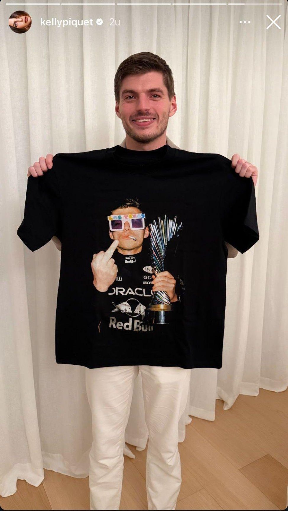 Eén exemplaar springt er echter wel tussenuit en wordt gedeeld op Instagram door vriendin Kelly Piquet. Verstappen is namelijk te zien met een geprint (AI-)shirt waar hij zelf op staat. Trofee in de hand, unieke bril op en gaan. Misschien een leuk merchandise-idee? Oordeel zelf!