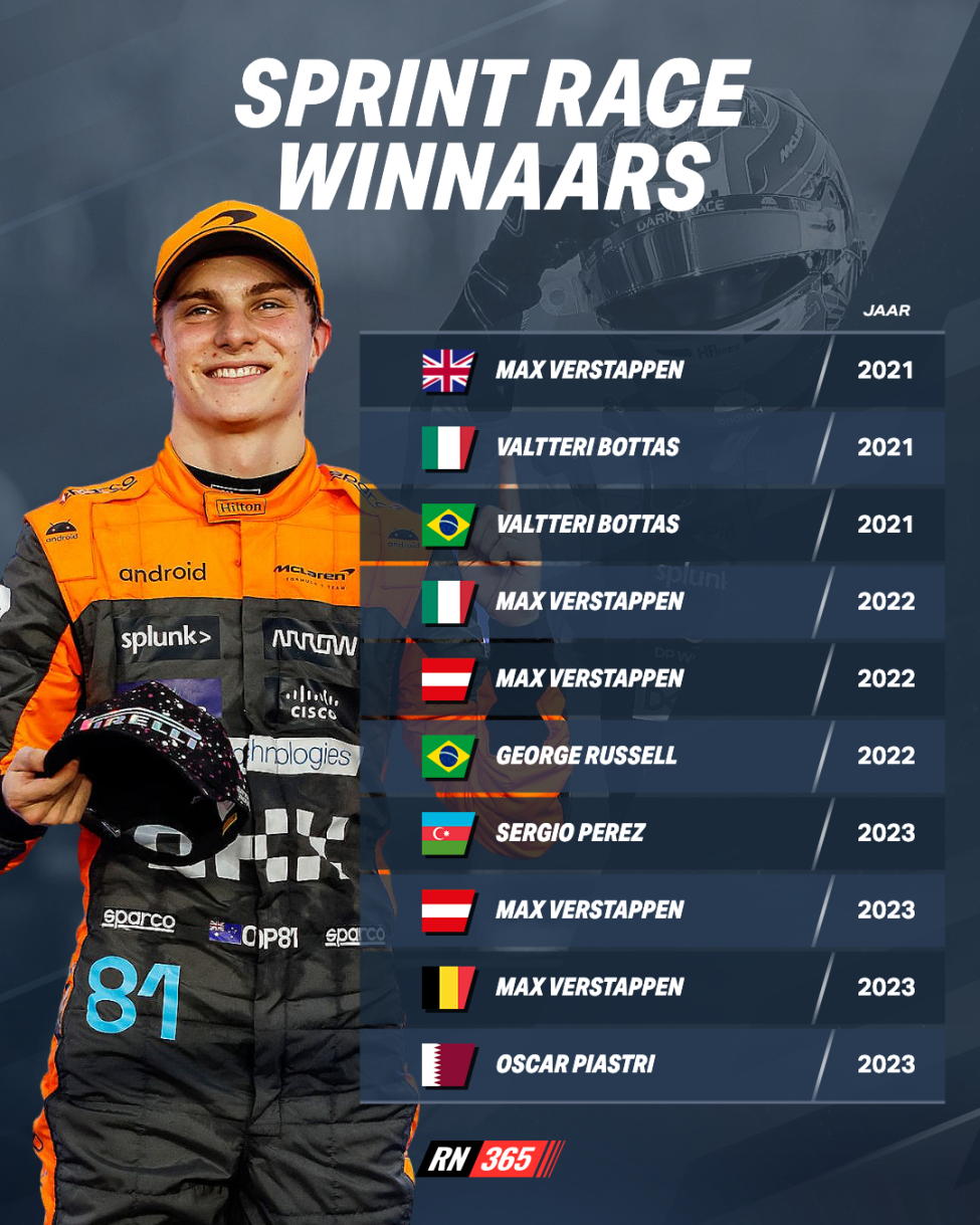 Oscar Piastri is de nieuwste sprintracewinnaar, terwijl er één coureur met kop en schouders bovenuit steekt als het gaat om het aantal zeges in de zaterdagrace. Juist, dat is Verstappen. Eerder was Valtteri Bottas nog een van de betere coureurs op de zaterdag. Naast Bottas, Piastri en Verstappen wonnen ook Sergio Perez en George Russell een sprint.