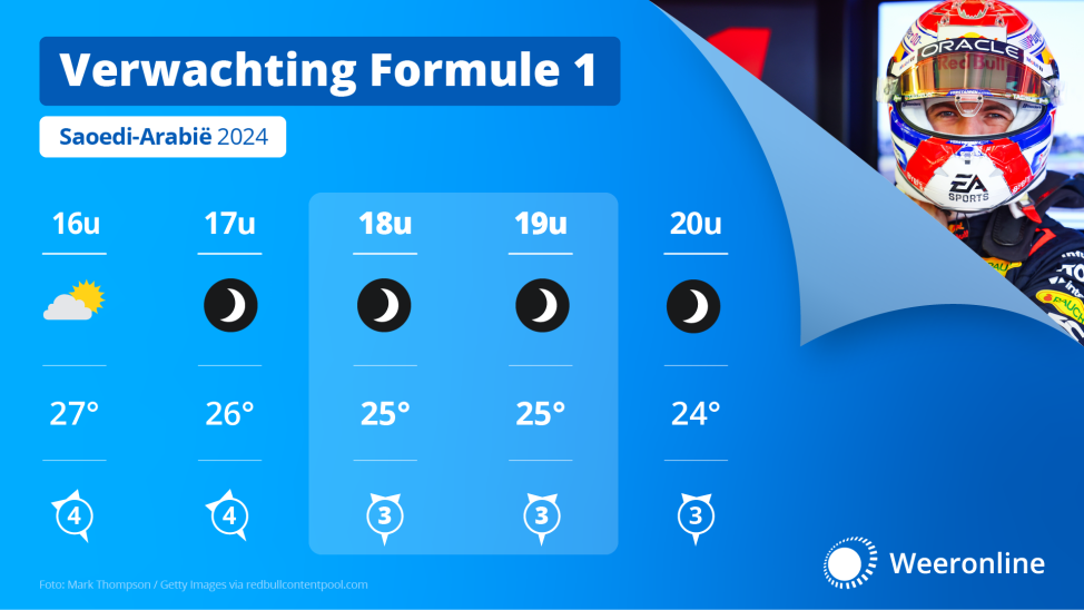 Het circuit in Saoedi-Arabië ligt pal aan de Rode Zee. Ten oosten van Jeddah ligt de woestijn. Bij een stevige wind uit het noordoosten, oosten of zuidoosten is kans op hinderlijke woestijnzand voor de F1-coureurs, maar de wind waait zaterdag overdag echter vanuit het noordwesten en dus vanaf zee. In de avond draait de wind geleidelijk naar het noorden, maar ook dit levert geen woestijnzand op. Uitstekende omstandigheden voor Verstappen dus!