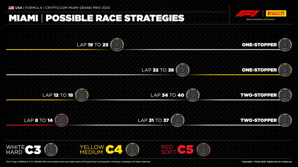 Desondanks heeft bandenleverancier Pirelli een aantal opties uiteengezet. Een éénstopper met de combinatie medium-hard lijkt het meest voor de hand te liggen. Per slot van rekening was de race vorig jaar ook een éénstopper. Het verschil is echter dat Pirelli dit jaar zachtere compounds meegenomen heeft. Met het oog daarop zijn er ook twee strategieën voor een tweestopper vormgegeven. In beide gevallen moedigt Pirelli de coureurs wel aan dan twee stints op de harde band te gaan rijden.