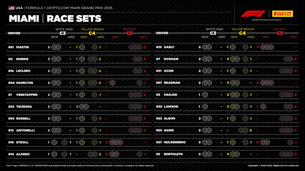 Wat betreft de overgebleven banden heeft iedereen het spelletje slim gespeeld. Of eigenlijk: iedereen heeft hetzelfde spelletje gespeeld. Alle coureurs van Red Bull, McLaren, Ferrari en Mercedes hebben nog twee setjes ongebruikte harde banden en één setje ongebruikte medium banden over. De enige uitzondering is Yuki Tsunoda, die nog twee setjes ongebruikte mediums heeft. Maar aangezien geen van de strategieën daarop inzet, zal dit Tsunoda waarschijnlijk geen groot voordeel opleveren. Hoe dan ook is er dus geen duidelijk strategisch voordeel voor polesitter Max Verstappen, of voor de coureurs die hem de winst hopen te ontzeggen.