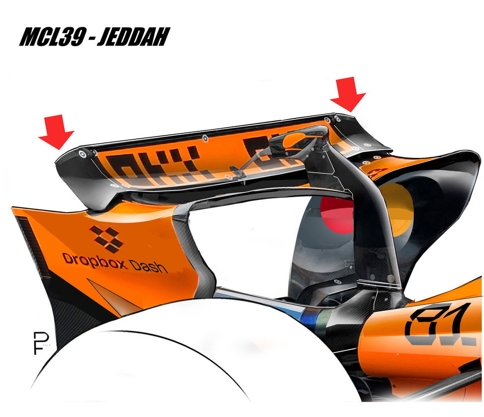 McLaren koos eveneens voor een vergelijkbare aanpak: een lage-downforce achtervleugel met een vrijwel rechte bovenrand. Alleen in het midden, bij de bevestiging aan de steun, loopt het profiel licht naar beneden. Die vorm zorgt voor iets minder luchtweerstand, wat vooral op het lange rechte stuk van Interlagos belangrijk is.