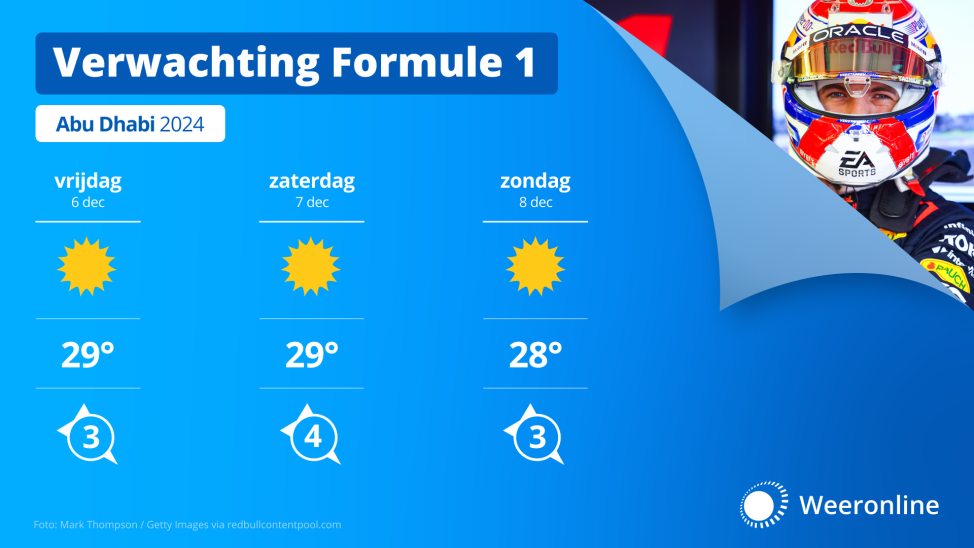 In Abu Dhabi zit er vaak woestijnzand in de lucht en dat is komende dagen ook het geval. Vooral vrijdag moeten de teams rekening houden met flink wat zand op de baan. Tijdens de race op zondag zal de concentratie zanddeeltjes in de lucht een stuk lager zijn.
