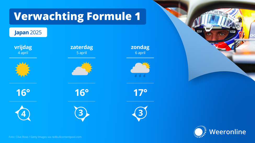 En er is een flinke kans dat het een spectaculaire race gaat worden. Er trekken namelijk buien over het circuit, maar er zijn ook droge momenten met wat zonneschijn. Het weerbeeld kan zodoende per ronde veranderen, met droge of natte omstandigheden tot gevolg. Daarbij waait de wind vanuit het zuidwesten en die is meest matig van kracht. Het weer lijkt daarbij koren op de molen voor Max Verstappen, die als geen ander uit de voeten kan in zulke omstandigheden. Bovendien won hij in 2022 op magistrale wijze de natte race op Suzuka.