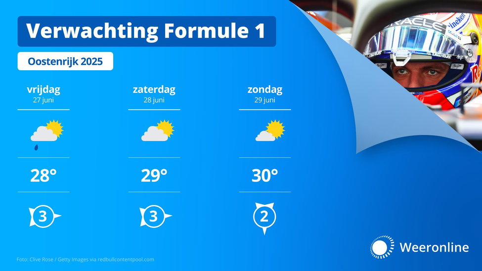 Dit weekend vindt de Grand Prix van Oostenrijk plaats op de Red Bull Ring. De buienkans is het hele weekend klein en het wordt behoorlijk warm met maxima rond 29 graden. Toeschouwers moeten rekening houden met een hoge zonkracht. Donderdag is het drukkend warm met kans op enkele stevige onweersbuien in de omgeving van het circuit. En ook vrijdagochtend is nog een bui mogelijk.