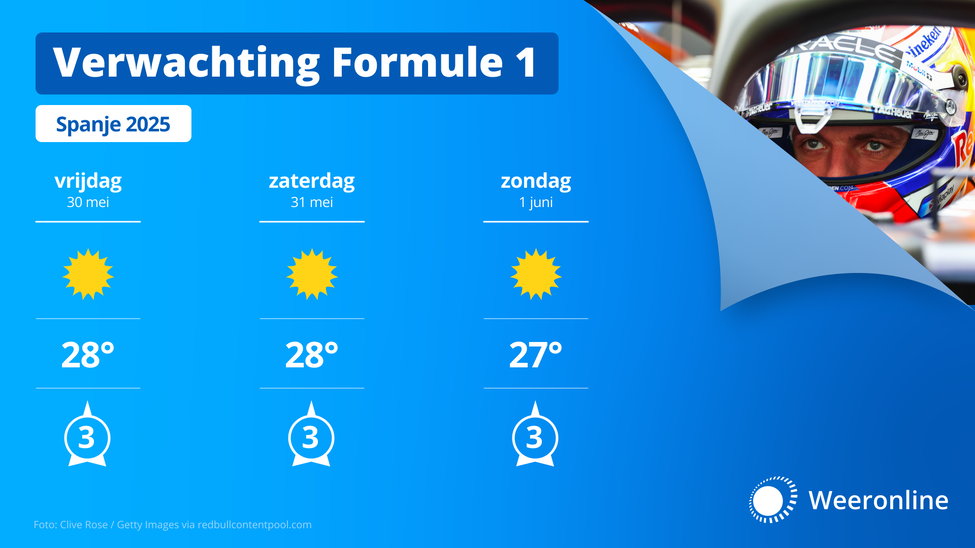 Het raceweekend verloopt namelijk zonovergoten en zomers warm. Ten noorden van het circuit, boven de Pyreneeën, is zaterdag en zondag wel kans op een onweersbui, maar de kans dat zo’n bui het circuit bereikt is nihil. De buitentemperatuur loopt in ieder geval op tot zo'n 28 graden. Voor toeschouwers is het gebruik van zonnebrandcrème dus een must. Zonder bescherming verbrandt je huid al in 10 tot 15 minuten.