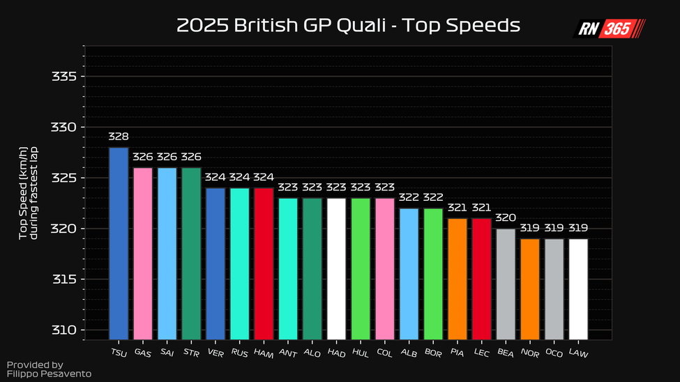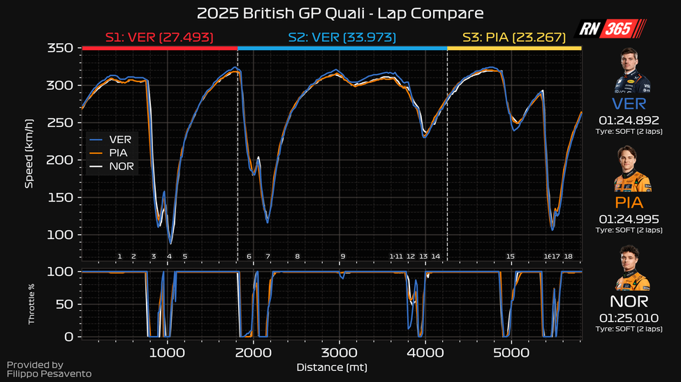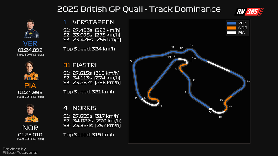 Uit de data blijkt dat de keuze van Verstappen en Red Bull perfect uitpakte. In de vrije trainingen stond Verstappen in haast geen enkel statistiekje bovenaan, maar nog geen 24 uur later is het blauwe lijntje veelvuldig te zien. Qua track dominance maakt Verstappen het verschil op de snelle stukken, mede door zijn hogere topsnelheid (maximaal 324 kilometer per uur). Alleen in de langzame bochten is de McLaren duidelijk sneller. Verstappen ging bijvoorbeeld ook met meer dan 300 kilometer per uur door Copse Corner.